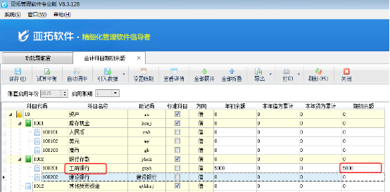 登錄亞拓管理軟件專業(yè)版,點(diǎn)“基礎(chǔ)資料”—》“期初建賬”,然后點(diǎn)“期初科目余額”功能按鈕,進(jìn)入“會計科目期初余額”錄入界面,如圖2所示,可以錄入每個會計科目的年初余額,以及本年的累計借方和貸方(不是從1月份開始啟用賬套時需錄入)。