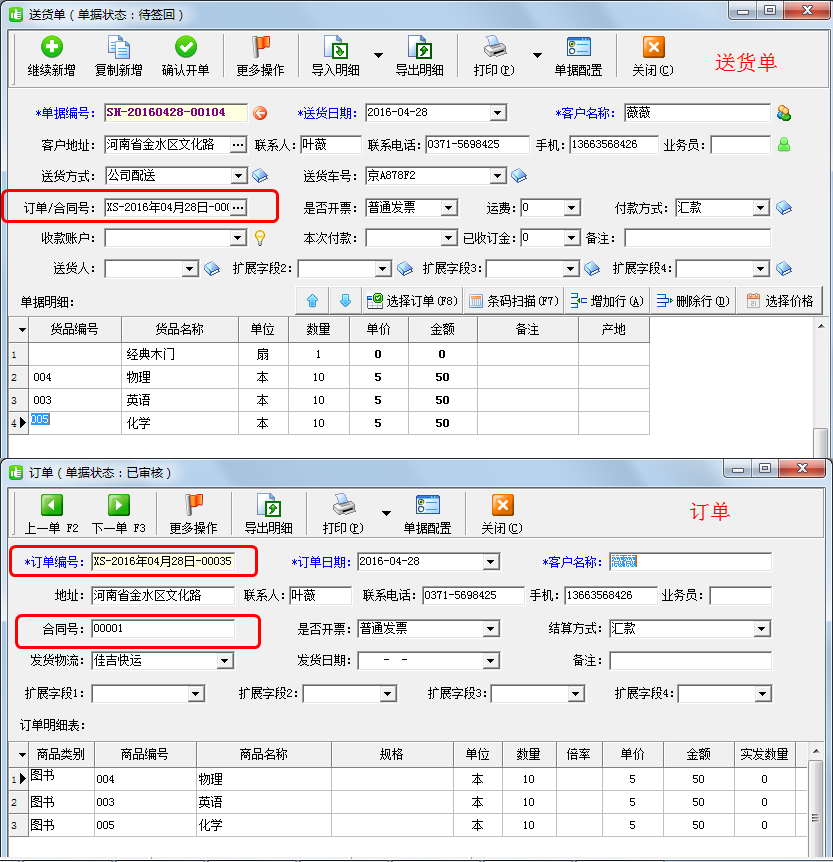 配置完之后,重新新增送貨單并引用訂單時“訂單/合同號”就會調取訂單的合同號,而不是訂單編號,如下圖所示: