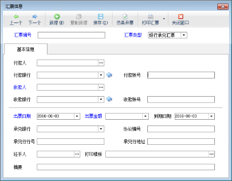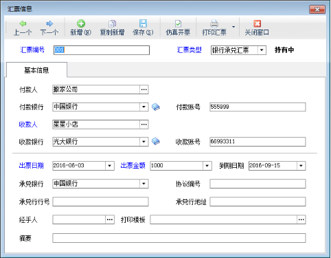 承兌匯票管理功能主要包括登記匯票、修改匯票、刪除匯票、查看匯票詳情、導入導出匯票數(shù)據(jù)、打印匯票、刷新匯票列表。