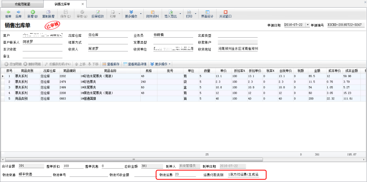 (4)僅登記運費:運費付款類別選擇“僅登記運費”時,保存并審核單據的時候,運費不會合計到“應收金額”內,且不會生成“物流運費應付款”,可以備注說明一下此單運費金額為多少。