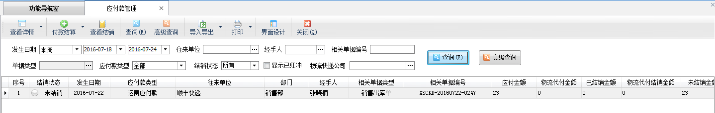 (1)我方付運費(生成運費應付款):運費付款類別選擇“我方付運費(生成運費應付款)”時,輸入物流運費后,保存并審核單據的時候,會生成“物流運費應付款”,在功能導航窗點“往來管理”—》“應付款管理”內對“運費應付款”進行運費付款結算即可。