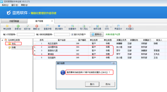 以圖1為例,客戶單位類別是“華南”的一共有5條記錄,現(xiàn)在要把第2條至第4條這3條記錄的單位類別改為“華北”。首先點擊第2條記錄,然后按下Shift鍵不松手時鼠標點擊第4條記錄,這樣就可以同時快速選中第2條至第4條這3條記錄,選中多條記錄后,再按住鼠標左鍵不松手,移動到單位類別“華北”處,此時系統(tǒng)會提示“是否要將當前選擇3個客戶的類別設置為【華北】?”,點擊“是”按鈕即可,如圖2所示。