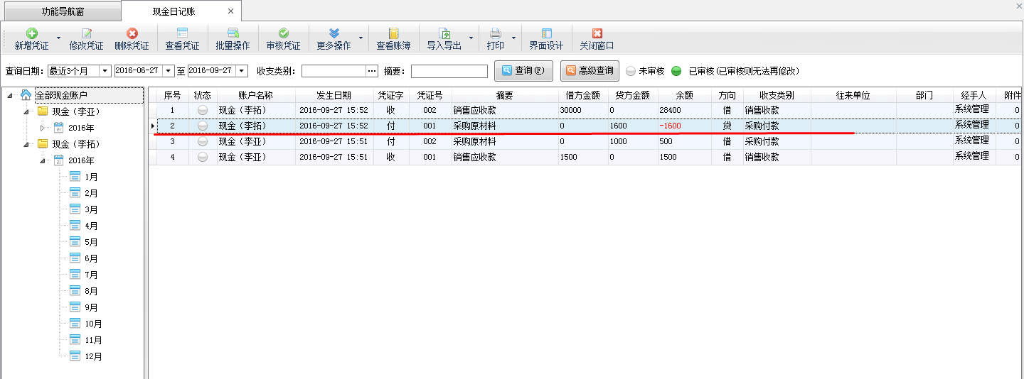 設置完成之后,我們在功能導航窗點擊“出納管理”——》“現金日記賬”打開現金日記賬界面,對現金賬戶“現金(李亞)”、“現金(李拓)”分別再新增兩條日記賬記錄來查看下憑證號,可以看到所有的資金賬戶憑證號為依次遞增,而不再是每個資金賬戶根據當前賬戶的憑證號進行依次遞增,如下圖三中所示。