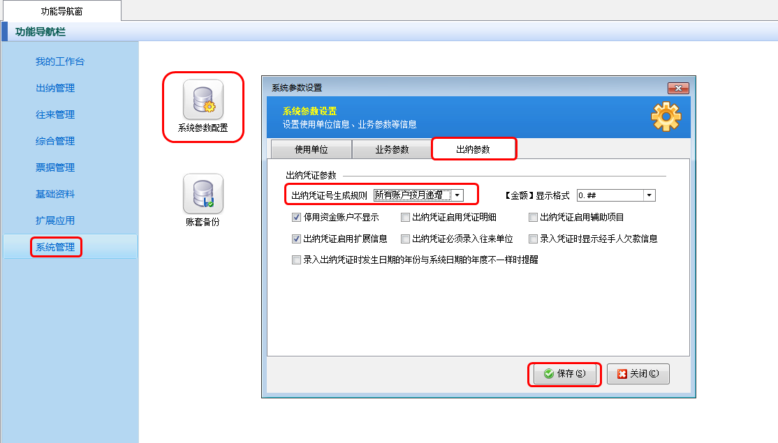 在功能導航窗點擊“系統管理”——》“系統參數配置”——》“出納參數”可以進入到“出納參數”設置界面,在此界面可以設置憑證號生成規則,如下圖二所示,此處設置為“所有賬戶按月遞增”。