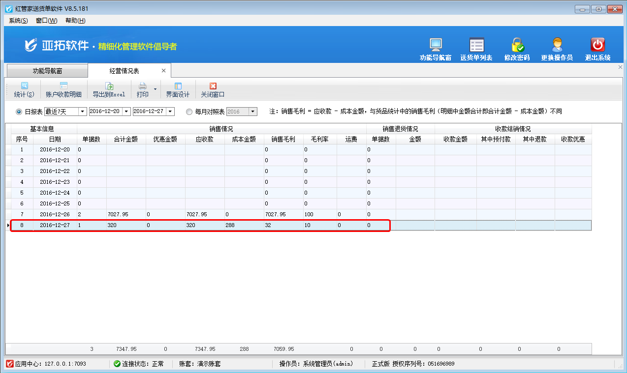 在功能導(dǎo)航窗點(diǎn)擊“業(yè)務(wù)處理”—》“相關(guān)統(tǒng)計(jì)查詢(xún)”(如下圖三所示),在相關(guān)統(tǒng)計(jì)查詢(xún)內(nèi)點(diǎn)擊“經(jīng)營(yíng)情況表”可以查看經(jīng)營(yíng)情況及銷(xiāo)售毛利,如下圖四中所示,今日應(yīng)收款金額為320元,成本金額為288元,銷(xiāo)售毛利為32元(銷(xiāo)售金額-成本金額=銷(xiāo)售毛利),毛利率為10%(毛利率=毛利/營(yíng)業(yè)收入×100%=(營(yíng)業(yè)收入-營(yíng)業(yè)成本)/營(yíng)業(yè)收入×100% )。