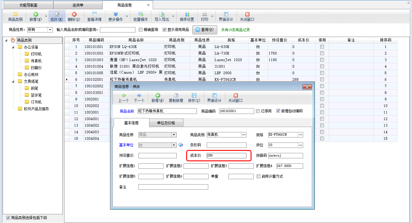 在功能導(dǎo)航窗點(diǎn)擊“基礎(chǔ)資料”—》“商品信息”打開(kāi)商品信息主界面,修改商品“松下熱敏傳真機(jī)”成本價(jià)為288元,如下圖一所示。