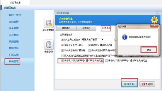 下邊以應(yīng)收款結(jié)算為例,介紹如何設(shè)置結(jié)算提醒轉(zhuǎn)記憑證,左側(cè)導(dǎo)航欄選擇系統(tǒng)管理,打開系統(tǒng)參數(shù)配置,選擇出納參數(shù),勾選上“保存收/付款結(jié)算單時,提示轉(zhuǎn)記出納憑證”保存參數(shù),具體如下圖所示: