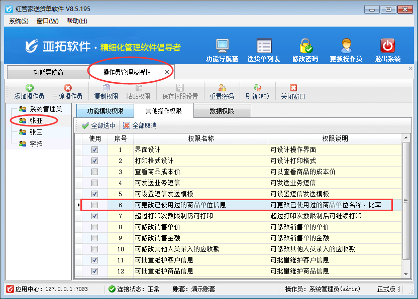 在功能導航窗點“系統(tǒng)管理”→“操作員及授權”即可進入“操作員管理及授權”界面,選中操作員賬號,在“其他操作權限”界面將“可更改已使用過的商品單位信息”權限打鉤取消,如下圖一所示,設置操作員賬號“張亞”不可更改已使用過的商品單位信息,設置完成后點擊“保存權限設置”按鈕保存設置。