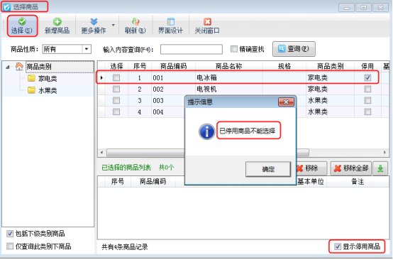 “選擇商品”窗口也可以顯示已停用的商品信息,勾選“顯示停用商品”,然后點擊“查詢”按鈕就會顯示出來已停用的商品。如果開單選擇已停用的商品,系統會提示“已停用商品不能選擇”,如圖3所示。