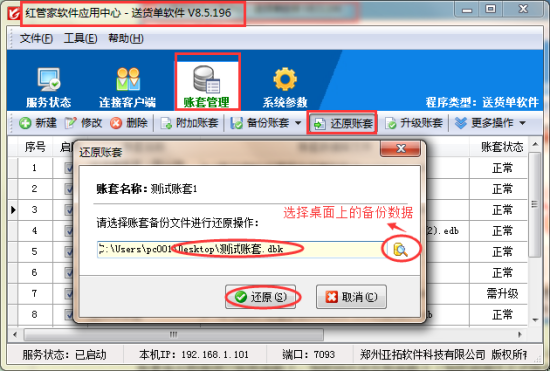 點擊“備份”后,賬套備份數(shù)據(jù)保存在桌面上,備份數(shù)據(jù)名字為“測試賬套.dbk”(可自己取名字),把這個賬套備份數(shù)據(jù)拷貝到新電腦上,加密鎖也放在新電腦上(加密鎖用于正式版本驗證),新電腦需要提前安裝好軟件,軟件安裝包可到亞拓軟件官網(wǎng)上下載(軟件下載地址),然后進(jìn)行備份數(shù)據(jù)還原操作,還原操作也是在應(yīng)用中心上,點擊“還原賬套”選擇拷貝過來的賬套備份數(shù)據(jù):測試賬套.dbk,點擊還原后,數(shù)據(jù)就會恢復(fù)到新電腦上,如下圖2所示: