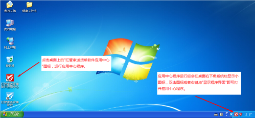 登陸時出現(xiàn)以上提示是因為應用中心程序沒有運行導致,此時將應用中心程序(紅色圖標)運行一下即可登陸,點擊桌面上的“紅管家送貨單軟件應用中心”程序圖標(或者在開始菜單中點擊程序組中的相應功能),即可打開運行應用中心程序。應用中心程序運行后會在桌面右下角顯示應用中心圖標,如下圖二所示。