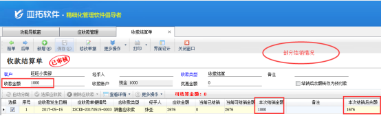 在“應(yīng)收款管理”中選擇應(yīng)收款,點擊“收款結(jié)算”進(jìn)入收款結(jié)算單界面,本次結(jié)銷部分金額和收款金額輸入一致,點擊“保存”則應(yīng)收款管理中狀態(tài)變?yōu)椤安糠纸Y(jié)銷”,下次付余款可以繼續(xù)選擇“部分結(jié)銷”的應(yīng)收款進(jìn)行結(jié)銷操作。如下圖3所示: