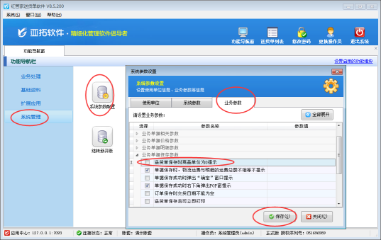 在功能導(dǎo)航窗點擊“系統(tǒng)管理”—》“系統(tǒng)參數(shù)配置”—》“業(yè)務(wù)參數(shù)”,即可進(jìn)入到“業(yè)務(wù)參數(shù)”配置界面,在業(yè)務(wù)單據(jù)保存參數(shù)內(nèi)找到“送貨單保存時商品單價為0提示”參數(shù),把這個參數(shù)的勾選去掉,然后保存,如下圖二所示。