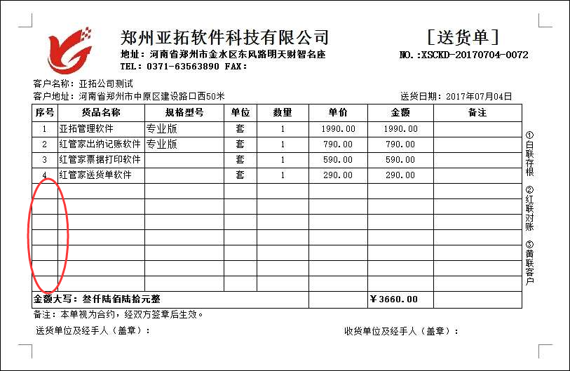 紅管家送貨單軟件、紅管家倉庫管理軟件及亞拓管理軟件等都支持開單打印單據(jù),軟件內(nèi)置了十幾種打印格式模版供客戶選擇使用,同時(shí)也支持自定義打印格式模版。一般情況下打印模版設(shè)置自動增加空行時(shí),空白行會不再顯示行號,如下圖一所示,如何設(shè)置才能讓表格一直顯示序號(行號),即使追加的空行也顯示?本篇文章以紅管家送貨單軟件為例來示范一下如何設(shè)置才能讓表格一直顯示序號(行號)。