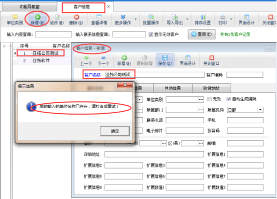 設(shè)置完成后,打開功能導(dǎo)航窗的“基礎(chǔ)資料”—》“客戶信息”。對一個已經(jīng)增加過的客戶名稱,點擊新增按鈕,輸入和之前已增加過的客戶名稱一樣的名稱,保存會提示“當(dāng)前輸入的單位名稱已存在,請檢查后重試!”,如下圖所示: