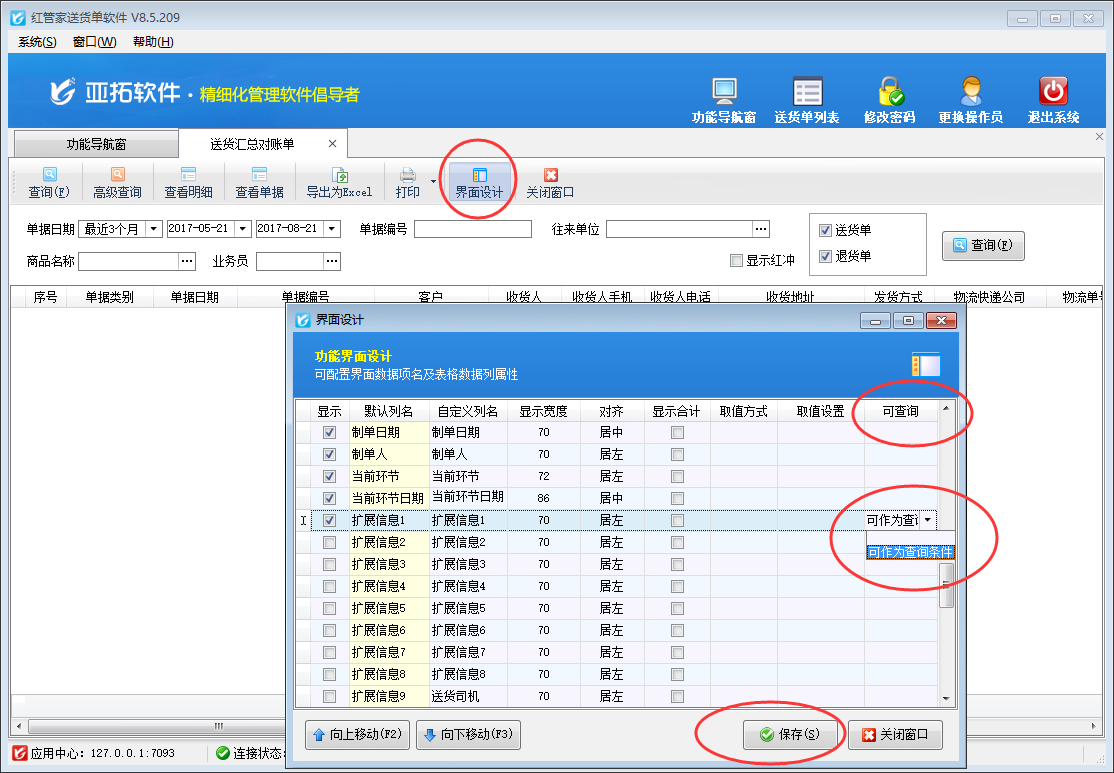 在“業(yè)務(wù)處理”界面右側(cè)相關(guān)統(tǒng)計(jì)查詢內(nèi)選擇“送貨匯總對(duì)賬單”即可打開(kāi)送貨匯總對(duì)賬單界面,點(diǎn)擊“界面設(shè)計(jì)”按鈕,在打開(kāi)的界面設(shè)計(jì)窗口中找到“擴(kuò)展信息1”,將其設(shè)置為可查詢條件,然后點(diǎn)擊“保存”按鈕即可保存設(shè)置,如下圖一所示。