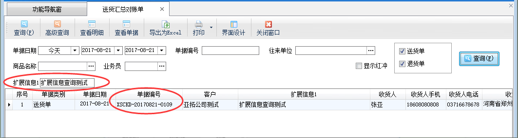 設(shè)置后關(guān)閉送貨匯總對(duì)賬單界面,然后重新打開(kāi),以上設(shè)置即可生效,此時(shí)送貨匯總對(duì)賬單即可根據(jù)“擴(kuò)展信息1”進(jìn)行查詢,如下圖二所示。