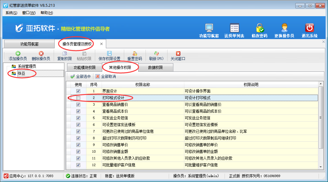 在功能導航窗點“系統(tǒng)管理”→“操作員及授權”即可進入“操作員管理及授權”界面,選中操作員賬號,在“其他操作權限”界面將“打印格式設計”權限打鉤取消,然后保存權限設置,如下圖一所示,設置操作員“張亞”沒有“打印格式設計”權限。
