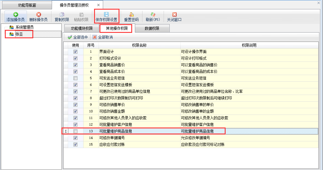 在功能導航窗點“系統管理”→“操作員及授權”即可進入“操作員管理及授權”界面,選中操作員賬號,在“其他操作權限”界面將“可批量維護商品信息”權限打鉤取消,然后保存權限設置,如下圖一所示,設置操作員“張亞”沒有“可批量維護商品信息”權限。