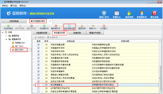 亞拓管理軟件和紅管家倉(cāng)庫(kù)管理軟件都可以對(duì)銷售單列表、采購(gòu)單列表、銷售訂單列表、采購(gòu)訂單列表進(jìn)行標(biāo)記備注。紅管家送貨單軟件也可以對(duì)送貨單列表和退貨單列表進(jìn)行標(biāo)記備注。如果不允許操作員標(biāo)記單據(jù)備注,可以對(duì)操作員取消“標(biāo)記單據(jù)備注”的權(quán)限。下面我們介紹一下在亞拓管理軟件專業(yè)版中設(shè)置操作員不可標(biāo)記單據(jù)備注的操作步驟。