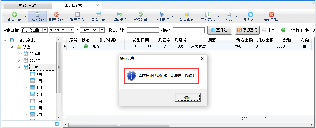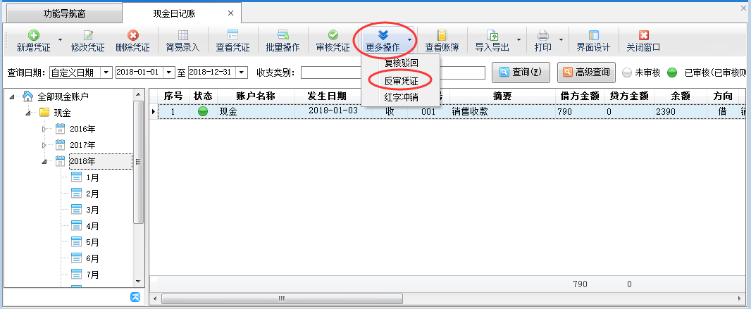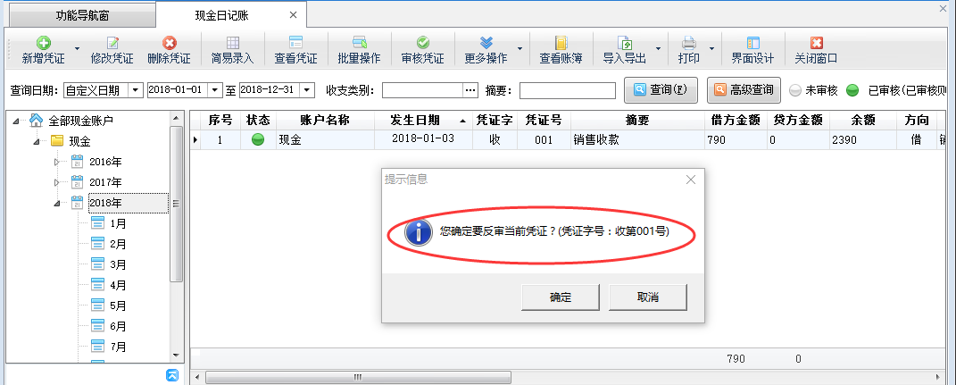 在功能導(dǎo)航窗點擊“現(xiàn)金日記賬”打開現(xiàn)金日記賬界面,選擇一個“已審核”的日記賬憑證,然后點擊“更多操作”—》“反審憑證”(如下圖二所示),系統(tǒng)會彈出提示信息“您確定要反審當前憑證?”(如下圖三所示),點擊“確定”按鈕即可對“已審核”憑證進行反審操作,反審后,憑證狀態(tài)變?yōu)椤拔磳徍恕保藭r可以對這個未審核的憑證進行修改操作(如下圖四所示)。