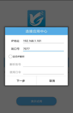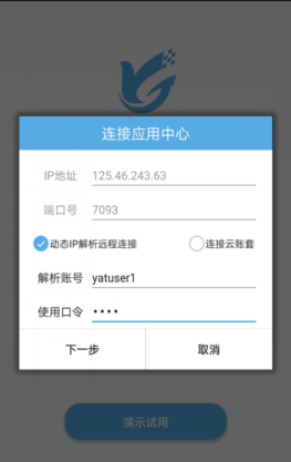 此連接需要購買動態(tài)IP解析服務(wù),在電腦端應(yīng)用中心啟用動態(tài)IP解析服務(wù)后,手機(jī)APP登錄界面點(diǎn)擊選擇賬套,勾選上啟用動態(tài)IP解析,輸入解析賬號和使用口令,點(diǎn)擊“下一步”選擇賬套登錄,如下圖4、5所示: