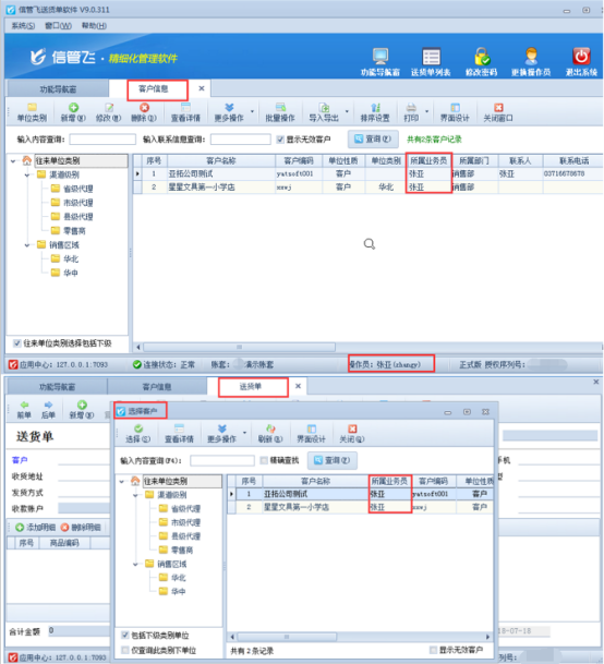 權限設置完成后,使用操作員“張亞”登錄軟件,在基礎資料—》客戶信息中可以看到僅顯示所屬業務員為“張亞”的客戶信息,在開單選擇客戶界面也僅顯示所屬業務員為“張亞”的客戶信息,如下圖3所示: