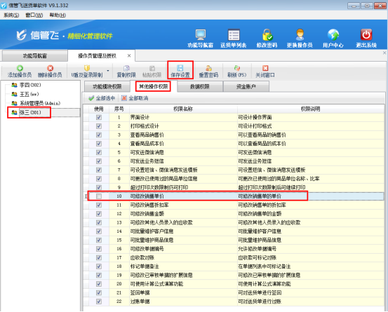 在功能導(dǎo)航窗選擇“系統(tǒng)管理”—》“操作員及授權(quán)”,進(jìn)入操作員管理及授權(quán)界面,以操作員“張三”為例,選擇操作員后,點(diǎn)擊“其他操作權(quán)限”,取消勾選“可修改銷售單價(jià)”,然后保存設(shè)置,如圖1所示。