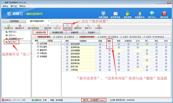 如果需要操作員不可刪除送貨單,軟件也支持設(shè)置操作員不可刪除送貨單權(quán)限,下面以來演示一下設(shè)置操作員不可刪除送貨單權(quán)限的操作步驟。