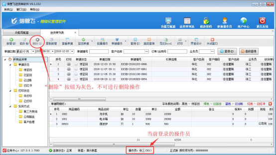 操作員權(quán)限設(shè)置完成后,關(guān)閉當(dāng)前窗口,更換操作員“張三”登錄軟件,點(diǎn)擊“業(yè)務(wù)處理”—》“送貨單列表”打開送貨單列表界面,此時可以看到“刪除”按鈕為灰色狀態(tài),不可操作,如圖4所示。