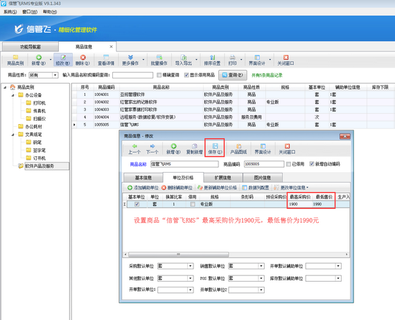 在功能導航窗點擊“基礎資料”—》“商品信息”即可打開“商品信息”界面,然后選擇商品,點擊“修改”按鈕,在“單位及價格”標簽頁可設置商品“最高采購價”及“最低售價”,如下圖一所示,設置商品“信管飛RMS”最高采購價為1900元,最低售價為1990元。