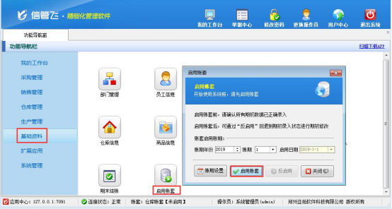 啟用賬期:是指準備從哪個月份開始使用軟件(舉例:假設當前月份為2019年6月份,但我們想從2019年1月份開始使用軟件,可以將啟用賬期設置為2018年、賬期為1,這樣我們需要整理的期初數據就應該是截止到2019-01-01前的期初商品庫存,開賬后就可以錄入2019-01-01之后的業務單據)。