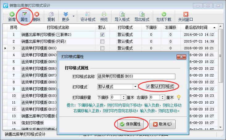 一、在打印格式設(shè)計(jì)界面工具欄的“屬性”中進(jìn)行操作。如示例需要設(shè)置“送貨單打印模板(B03)”為默認(rèn)模板,選擇B03模板,點(diǎn)擊工具欄中的“屬性”,彈出的打印格式屬性界面,在“默認(rèn)打印格式”處打勾,然后保存屬性。如下圖所示: