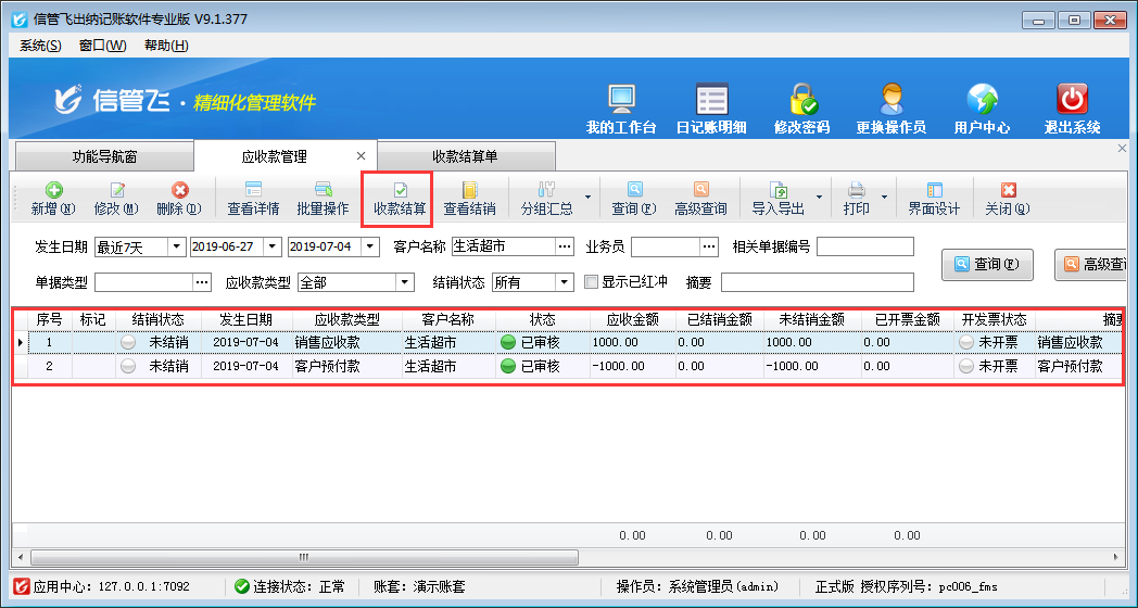 在應收款管理界面工具欄有“收款結算”按鈕,可以打開收款結算單對客戶應收款/預付款進行收款結銷。如下圖所示,客戶“生活超市”應收金額1000元,客戶預付款1000元,在單據明細“本次結銷金額”中,應收款輸入正數,預付款輸入負數,正負抵消,即可使用客戶預付款沖銷應收款。