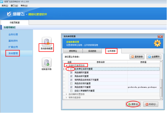 登錄軟件,在“系統(tǒng)管理”—》“系統(tǒng)參數(shù)配置”—》“業(yè)務(wù)參數(shù)”中的“數(shù)據(jù)可否重復(fù)參數(shù)”把“往來單位名稱可重復(fù)”的勾選符號取消,然后保存設(shè)置。如下圖所示: