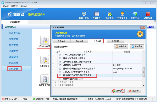 在功能導(dǎo)航窗點(diǎn)擊“系統(tǒng)管理”→“系統(tǒng)參數(shù)設(shè)置”→“業(yè)務(wù)參數(shù)”可以打開(kāi)“業(yè)務(wù)參數(shù)”配置界面,在業(yè)務(wù)單據(jù)相關(guān)參數(shù)內(nèi)打鉤啟用“已發(fā)貨的訂單不可修改不可紅沖”參數(shù),然后點(diǎn)擊“保存”按鈕保存設(shè)置,如下圖1所示。