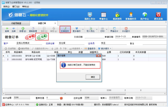 歡迎下載試用可控制訂單發(fā)貨完成不允許修改和紅沖功能的軟件:信管飛倉(cāng)庫(kù)管理軟件