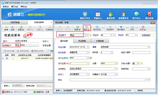 信管飛RMS標(biāo)準(zhǔn)版和專業(yè)版中增加了出納模塊,可以登記現(xiàn)金銀行日記賬。信管飛RMS 軟件中用戶在做收款結(jié)算后如需要把這筆賬管理到日記賬中,可以在收款時轉(zhuǎn)記到出納日記賬中。在軟件中如何操作呢?