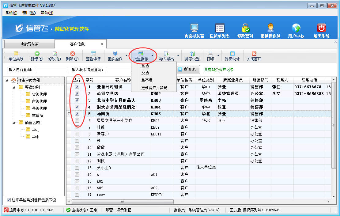在功能導(dǎo)航窗選擇“基礎(chǔ)資料”—》“客戶信息”進(jìn)入客戶信息管理界面,選擇工具欄的“批量操作”按鈕,進(jìn)入批量操作模式,選擇需要刪除的客戶信息(批量操作支持全選、全不選、反選),如下圖所示: