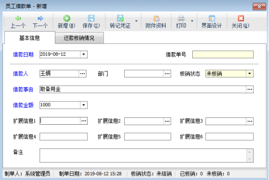 查看詳情:在借款單列表中,選擇一個借款單,點(diǎn)擊工具欄中的“查看詳情”銨鈕,彈出“借款單信息”窗口。可查看借款情況和核銷情況。