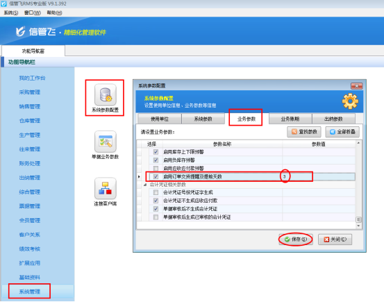 在功能導航窗點擊“系統(tǒng)管理”—》“系統(tǒng)參數(shù)配置”—》“業(yè)務參數(shù)”,打勾“啟用訂單交貨提醒及提前天數(shù)”,在參數(shù)值內可以錄入需要提前的天數(shù),再保存設置,如下圖所示: