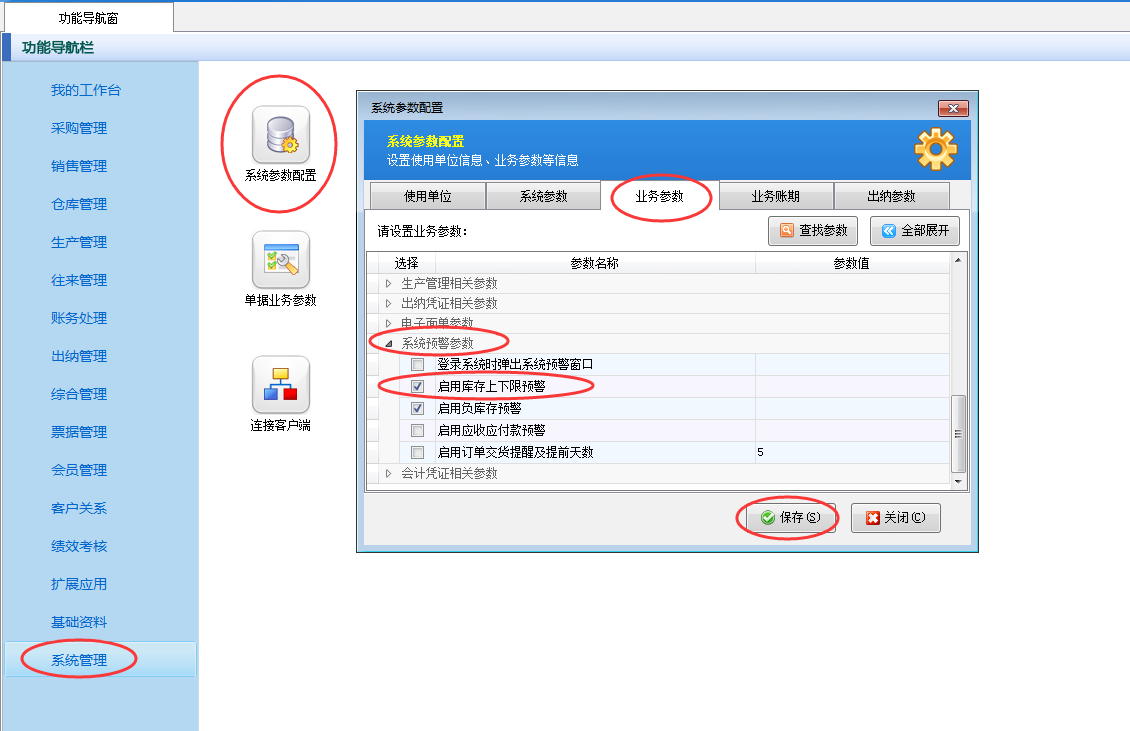 在功能導(dǎo)航窗點(diǎn)擊“系統(tǒng)管理”—》“系統(tǒng)參數(shù)設(shè)置”—》“業(yè)務(wù)參數(shù)”,即可進(jìn)入到“業(yè)務(wù)參數(shù)”配置界面,在系統(tǒng)預(yù)警參數(shù)內(nèi)將“啟用庫存上下限預(yù)警”參數(shù)啟用一下,設(shè)置完成后點(diǎn)擊“保存”按鈕保存配置,如下圖所示。