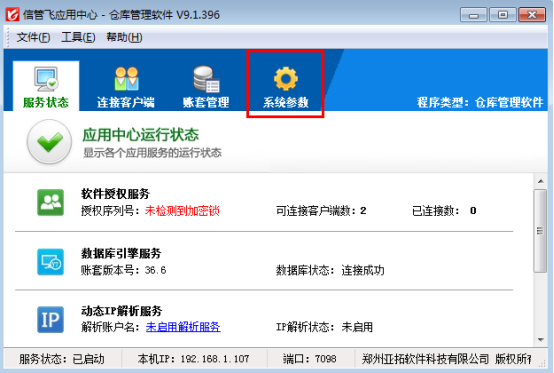 亞拓軟件采用新架構技術開發的信管飛RMS(進銷存軟件)、信管飛送貨單軟件、信管飛出納記賬軟件、信管飛倉庫管理軟件等都包括應用中心及客戶端程序,“應用中心”是系統的管理控制中心,集中管理連接客戶端和賬套數據庫,從而實現數據的集中存儲和實時共享,應用中心主要包括運行狀態管理、連接客戶端管理、賬套管理、系統參數設置以及其他管理功能。