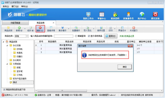 在功能導航窗選擇“基礎資料”—》“商品信息”進入商品信息界面,對于重復的已開單商品點擊刪除按鈕會提示“當前商品在業務單據已有使用,不能刪除!”如下圖所示: