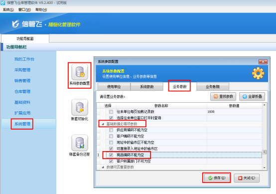 打開“系統(tǒng)管理”—》“系統(tǒng)參數(shù)配置”選擇業(yè)務(wù)參數(shù)的“基礎(chǔ)數(shù)據(jù)必填項(xiàng)參數(shù)”中的“商品編碼不能為空”勾選上此參數(shù),點(diǎn)擊保存按鈕,如下圖所示:
