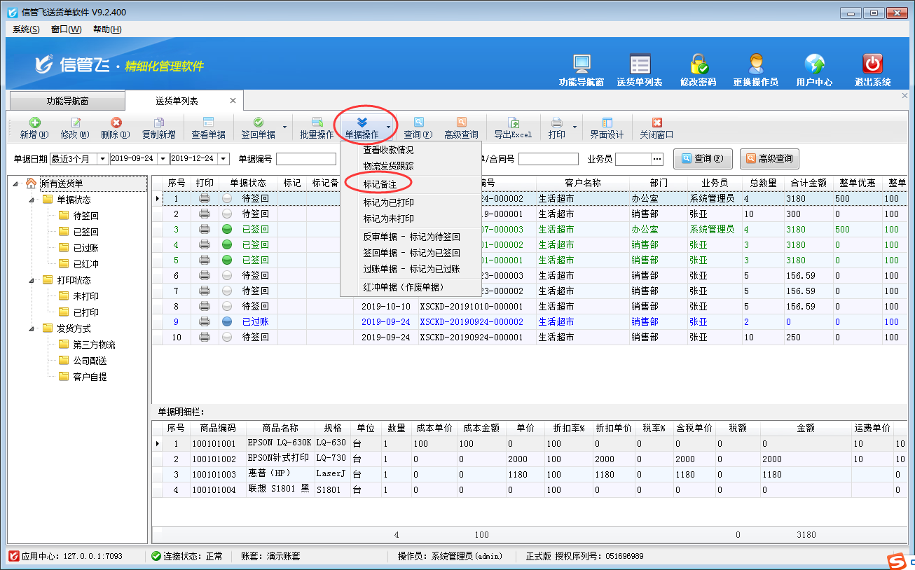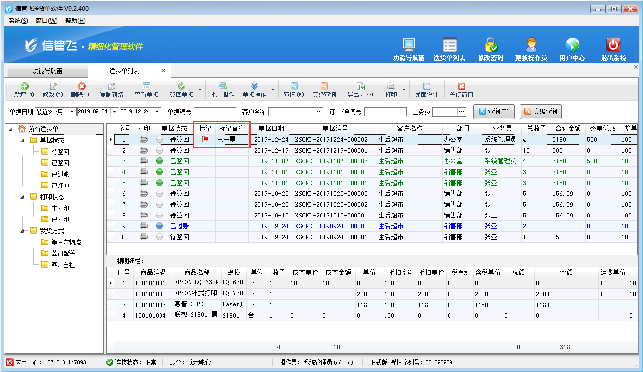 信管飛送貨單軟件支持對訂單列表、送貨單列表以及退貨單列表標(biāo)記備注。本文介紹一下送貨單軟件中對送貨單列表標(biāo)記備注的具體操作步驟。