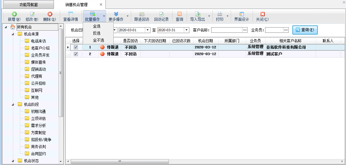 在功能導(dǎo)航窗點(diǎn)擊“客戶關(guān)系”—》“銷售機(jī)會(huì)”打開銷售機(jī)會(huì)管理界面,選擇工具欄的“批量操作”按鈕,進(jìn)入批量操作模式,選擇需要批量設(shè)置的銷售機(jī)會(huì)(批量操作支持全選、全不選、反選),如下圖所示: