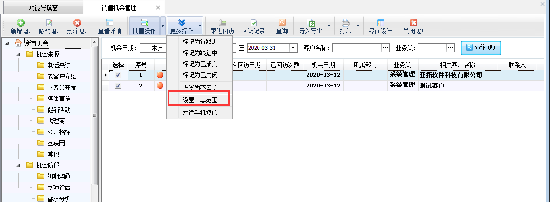 銷售機(jī)會(huì)管理用于管理在推銷過程中,由于環(huán)境發(fā)生變化,給銷售人員提供的實(shí)現(xiàn)其推銷目的的一種可能性,即銷售線索,各種途徑搜集過來的銷售業(yè)務(wù)信息(如客戶需求、購(gòu)買意向、招投標(biāo)信息等)。銷售機(jī)會(huì)信息可根據(jù)共享范圍進(jìn)行設(shè)置,實(shí)現(xiàn)銷售機(jī)會(huì)的分級(jí)管理。本篇文章介紹一下如何批量設(shè)置銷售機(jī)會(huì)共享范圍?