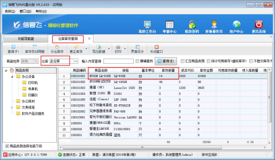 本文章以“信管飛RMS星光版”為例,示范下如何開“盤點單”。在功能導航窗點擊“倉庫管理”--倉庫庫存查詢,可查詢出商品的當前庫存數量,以示范商品“EPSON LQ-630K”的庫存數量為例,當前查詢到庫存數數量為14。存在多倉庫情況的,需要先選擇倉庫然后再進行查詢,是獲取查詢的倉庫中的庫存數量,如下圖所示: