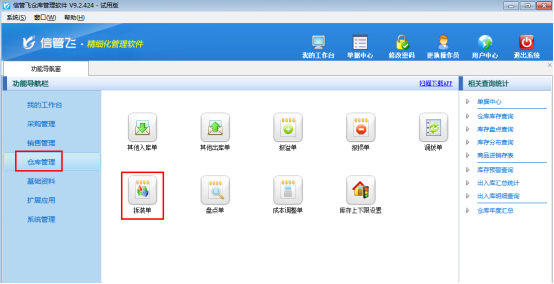 信管飛RMS專業(yè)版、信管飛倉(cāng)庫(kù)管理軟件中包含拆裝單功能的使用,下面我們以信管飛倉(cāng)庫(kù)管理軟件為例來演示一下具體的操作步驟。